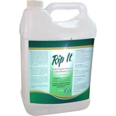 Rip It is a handy, universal all natural cleaner, stain remover and degreaser with hundreds of uses in the home, business and industry, eliminating the need for dozens of specialty cleaners. Using ingredients that are naturally derived, this powerful formula is perfect for cleaning and sanitising in the food and beverage industry. Particularly suitable for cleaning in hotels/motels/pubs, kitchens/canteens, nursing homes, surgeries, vet clinics, abattoirs etc.